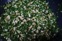 把鸡蛋和切碎了的韭菜放豆腐上.