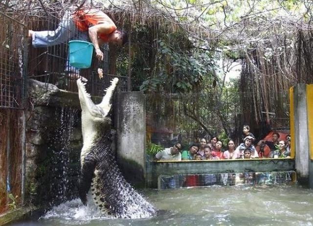 不明白为什么喂养鳄鱼要用人工,我觉得还是机械比较靠谱。要是哪天鳄鱼的跳跃能力进步了,那后果不敢想象。