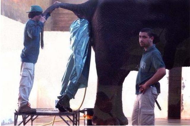 大象的兽医,正在为大象检查肠胃,这真的不知道怎么评价了,不知道要多高的工资才会挑战自己的心理极限。