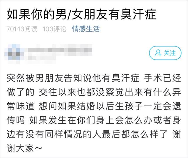 姑娘表示,她现在担心的是,男友的臭汗症会不会遗传给下一代。所以来萧内网发帖,想听听大家的意见。