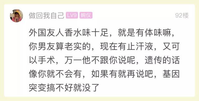 而且,有网友认为,男友能主动告知这事,可见他的坦诚,比起性格和品德,臭汗症不算什么。
