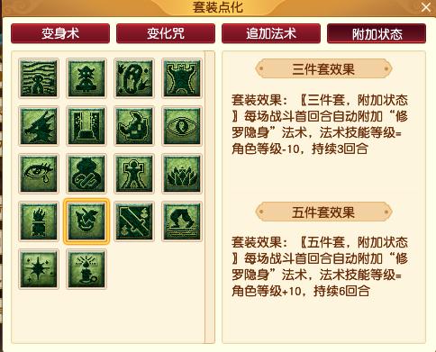 修罗隐身套的效果是每场战斗首回合自动附加“修罗隐身”法术,三件套持续3回合,五件套持续6回合。