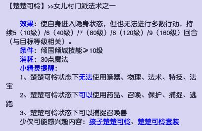 楚楚可怜会让玩家进入隐身状态,这个状态下虽然不能用暗器、物理、法术、特技、法宝,但是可以使用药品、召唤、保护、捕捉、逃跑。通常情况下,这是一个专门用来抓召唤兽的套装。